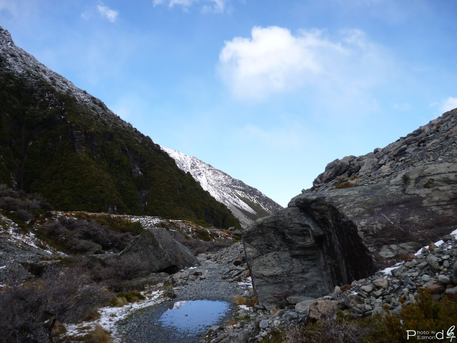 虽然下了雪后的景色真的很漂亮,但也因为之前的坏天气,Hooker Valley Track的步道难度提升了。根据之前有走过相同步道的Ruth姐说,现在我们看到的小溪,很多之前都是步道,但因为连日的大雨和下雪,现在步道都成了小溪。由于部分步道都成了小溪,如果不想弄湿鞋子的旅客就必须尽可能的找到较高的地方来越过这段步道。我们曾经因为真的走不到一条可行的路径而差点放弃啊。。。最后,我们当然是找到了一条可以不弄湿鞋子而前进的路径,哈哈,这些都难不倒我们的!!!过了这段步道,后面的步道就没有遇上类似步道变成小溪的难题了。好了,继续前进。